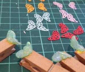 新作用の切り絵が終わり、ようやくレジンでの作業に入っています。小さくて可愛い蝶々が出来上がる予定です!