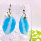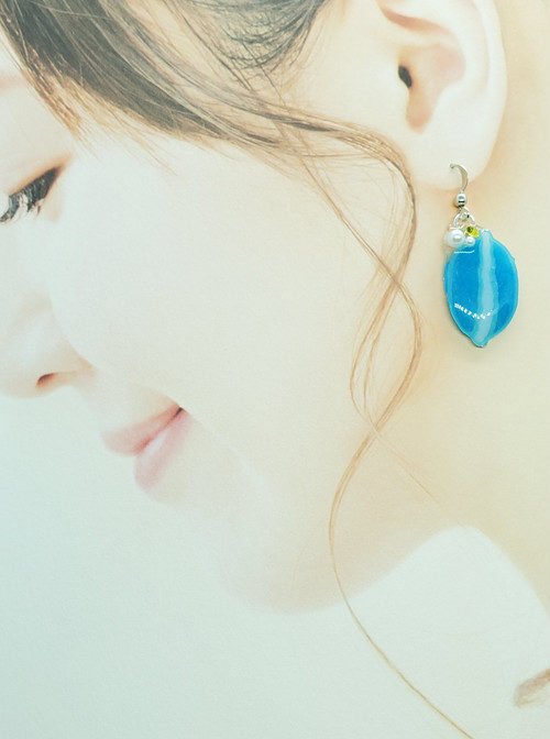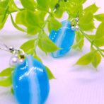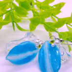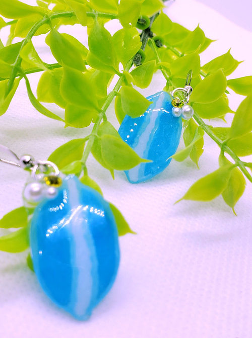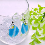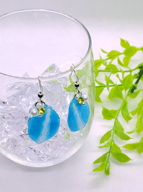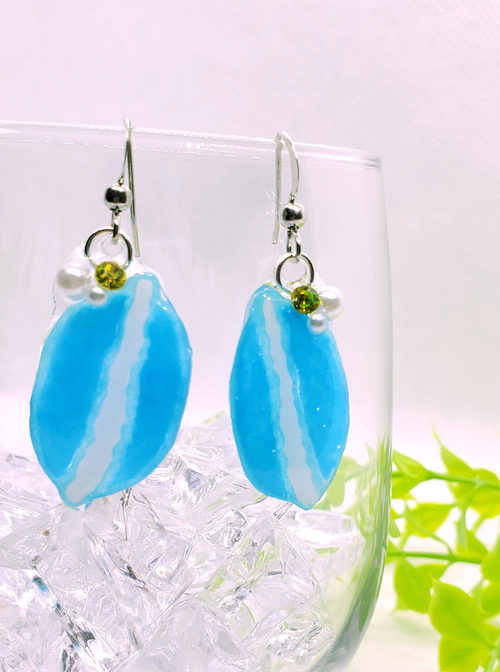 マカロン形に切り抜いた切り絵に、爽やかな青いパールカラーに着色したレジンを流し込んだ切り絵レジンアクセサリーです。